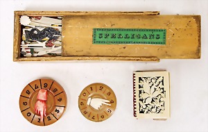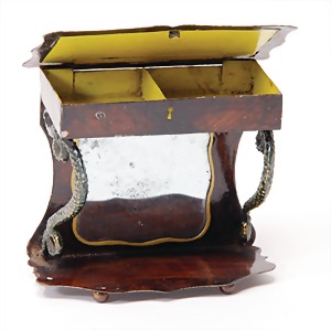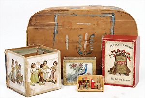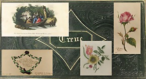 small casket "Treue", filled with a few single sheets, inside handcoloured chromolithography, for fold out, sheets with aphorisms and decoration, c. 1840