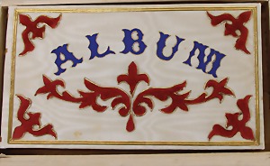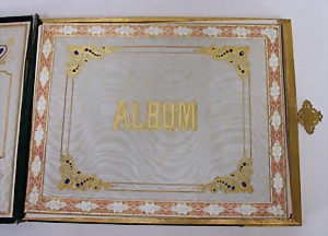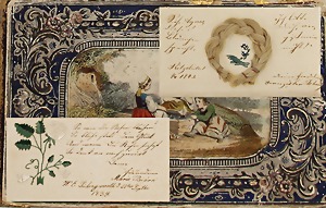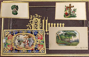 album for Karl Gotthardt, 1838 - 1875, by father, mother, relatives, friends, Spandau, Berlin (Cechy, Schleswig), 10 Viennese tickets, 13 colored lithographies, 1 watercolor, is a museum piece, cover with gold relief printing, edge is caused of old age in worn condition, inside nice original condition