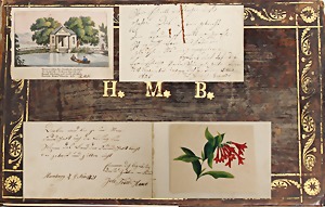 H.M.B., autograph book, around 1820, many entries, handcoloured pictures, not all sheets are labeled, cover with relief printing, a bit worn