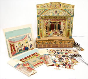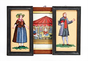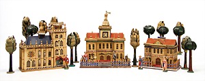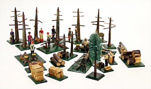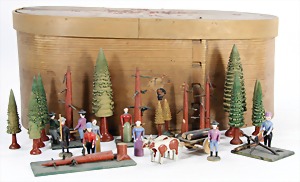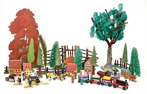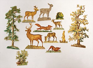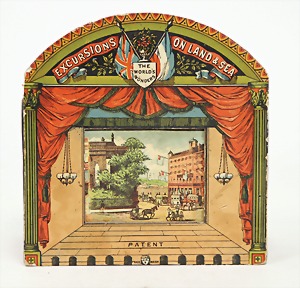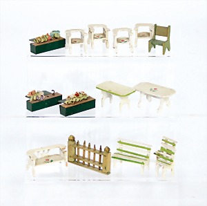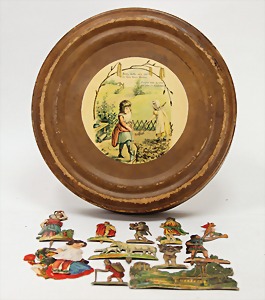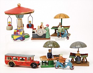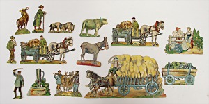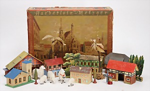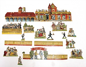setting up game pieces made of paper, with landscape and parts of buildings, restaurant, café, the beer garden, height of the figures 7.5 cm, pressed cardboard, colored lithographed, around 1900, decorative