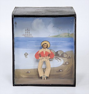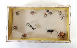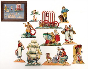 beach life, sea resort, pressed cardboard, multicolored lithographed, height d. set up-figures c. 8.5 cm, persons, ships, beach chair, etc., richly, around 1900