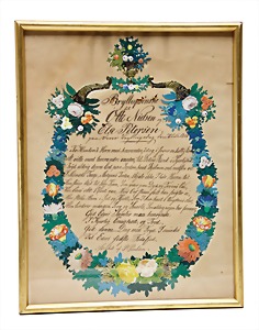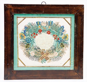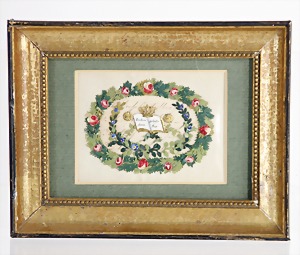 paper work, framed, 1849, saying with floral decor, outside edge of gold, inside measurement 25 x 26.5 cm