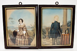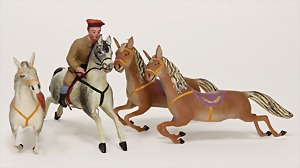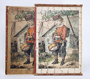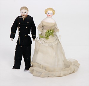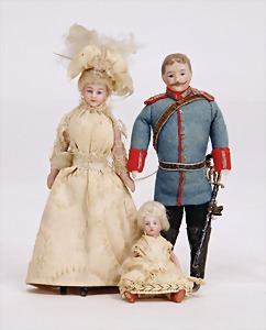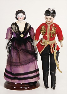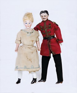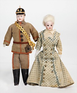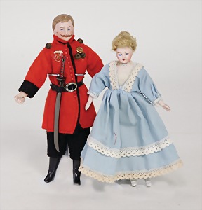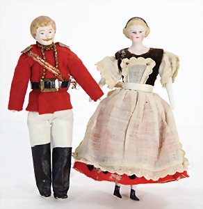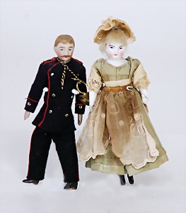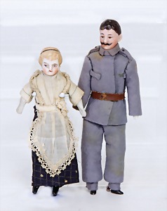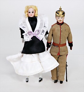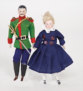 2 dollhouse dolls, soldier, 16.5 cm, bisque breast plate head, arms, and legs, appropiated moustache, fabric body, felt clothes are more recent, lady, 15 cm, bisque breast plate head, arms, and legs, wig with hairloss that is caused of old age, fabric body, old clothes