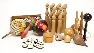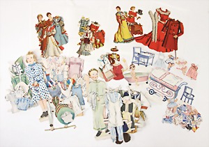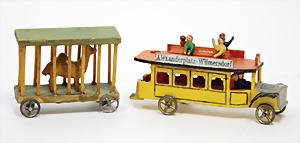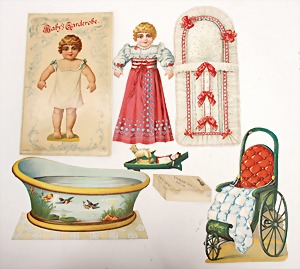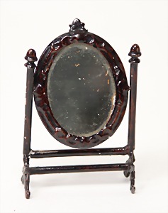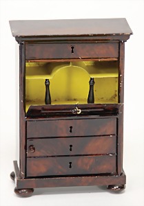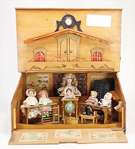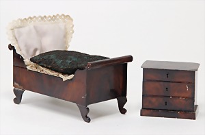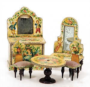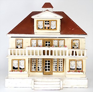manufacture dollhouse, 2-storey, with oriel and balcony, 31 x 25 x 55 cm, paper stuck, with some patches with flaws, ground floor with nice Biedermeier wood furnishings, coveredwith silk, table, 3 chairs, 2 armchairs, corner shelfs, standing mirror and chest of drawers, small tin stove, in upper floor 1 children's room with 3 tin beds, 1 linen cupboard, glazed door, 2 small porcelain doll, bearskin, 2 wall paintings, 1 mirror, tin