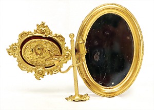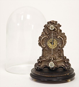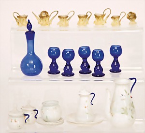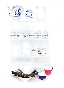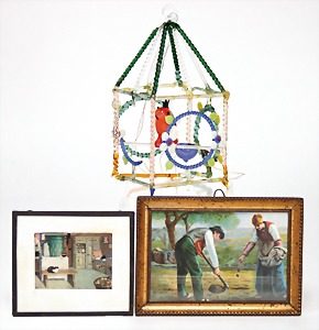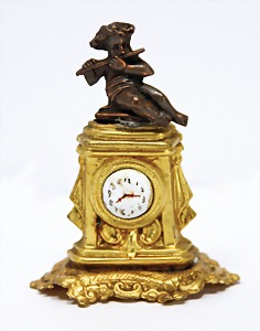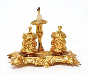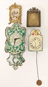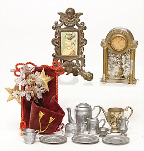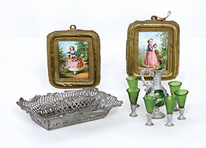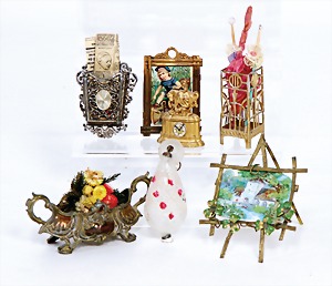 dollhouse decoration pieces, clock for fireplace, sheet brass gilded, 4.5 cm, small easel, picture, umbrella stand, tin, magazine rack, tin, lamp, glass