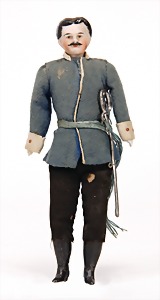 2 dollhouse dolls, soldier, with spiked helmet, 16 cm, bisque breast plate head, arms, and legs, up-painted moustache, fabric body, original felt clothes, with sword, lady, 16.5 cm, fix inset glass eyes, bisque breast plate head, arms, and legs, fabric body, clothes old or sewed of old fabric