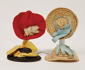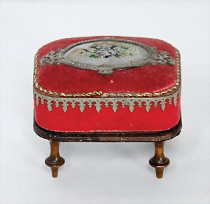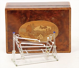 small casket, shaped like a stool, inside with stick, handle is made of ivory, 5.5 cm, top hat and gloves, all in all 6 x 7 cm, for a high-quality room or fashion shop