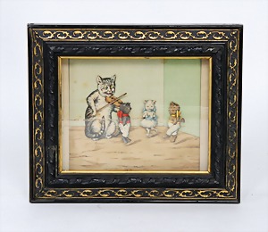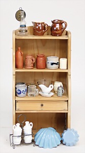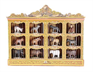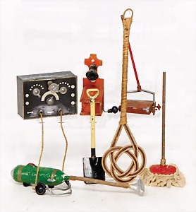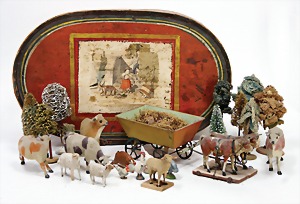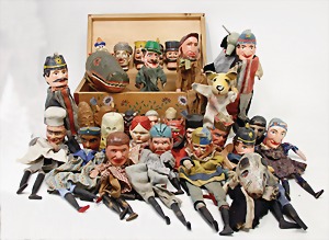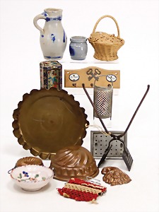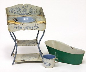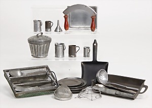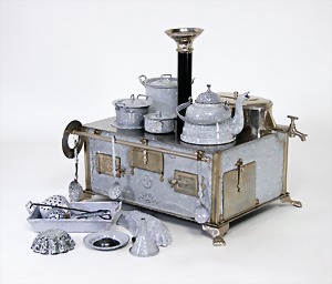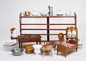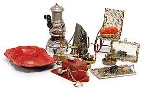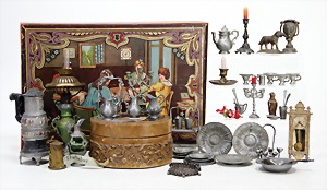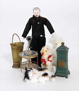 dollhouse decoration pieces, grandfather, 15 cm, bisque breast plate head, arms, and legs, clothes are made of fabric, small telephone, tin, umbrella stand, stamped sheet brass, small tin stove, small pelt cat, skin dog, side table