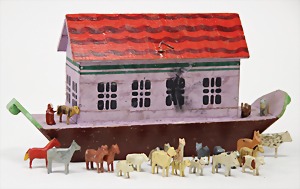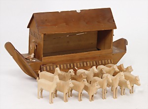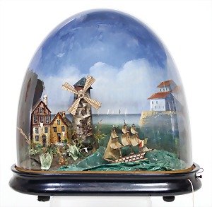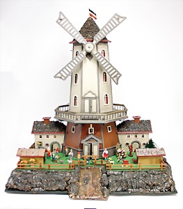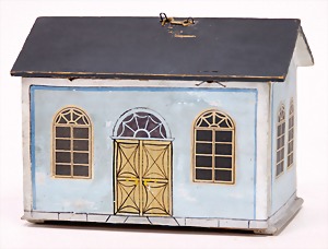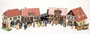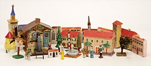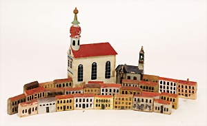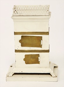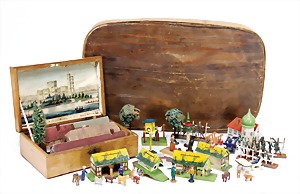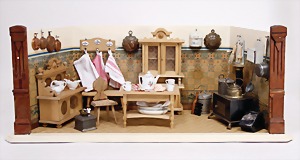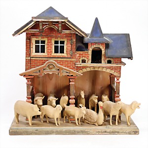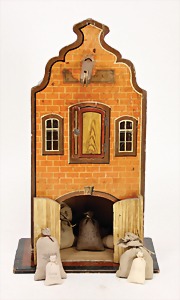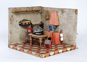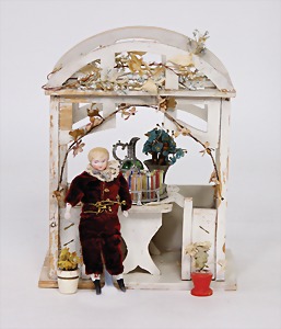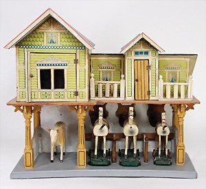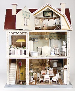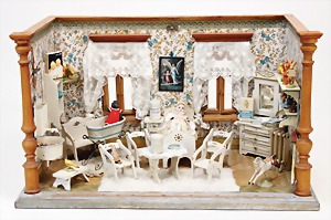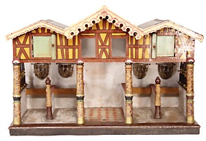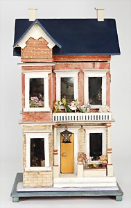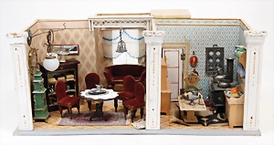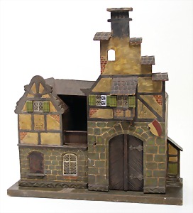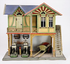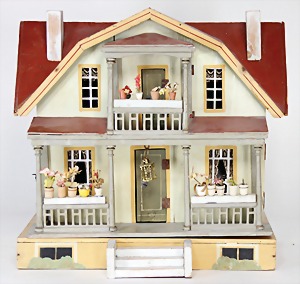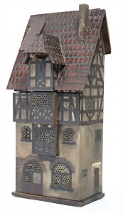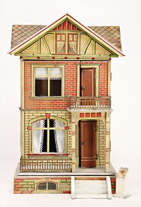 3-storey house, 65 x 40 x 80 cm, with staircase, 3 passage doors, old and wallpaper at floor and wall, ground floor with living room and oriel, wooden furnishings, covered with silk, ornaments, glued on paper , sheet metal, sheet metal stove, beaded chandelier, upper floor bedroom, art nouveau, wood, bed with cupboard, chest of drawers and washstand, small balcony set, handpaintedsheet metal, table with sunshade and chair top floor can be opened, with clothesline and ironing board