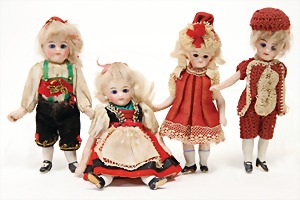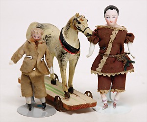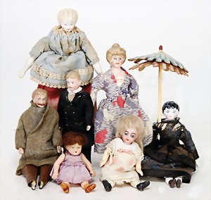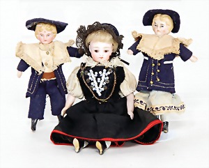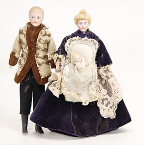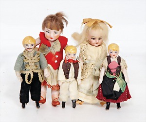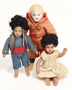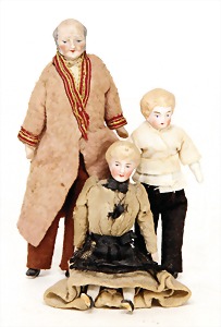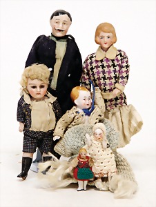 3 dollhouse dolls, children, 10.5 cm, mother, 15 cm, bisque heads, arms, and legs, fabric body, old clothes