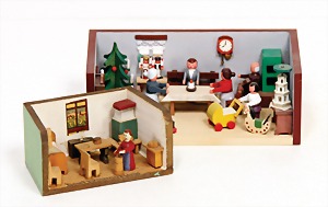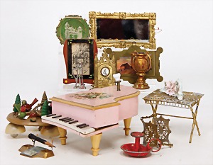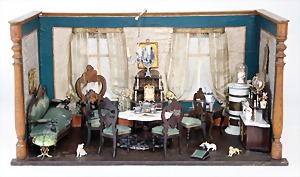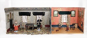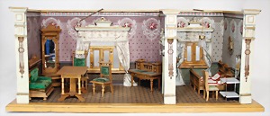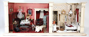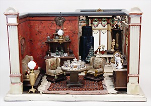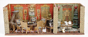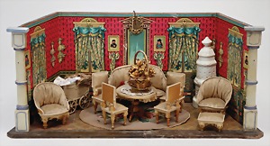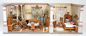 2-part room, with oriel, 94 x 40 x 37 cm, around 1900, living room-furniture program, probably GOTTSCHALK, corner sofa with superstruction and small cabinet, mirrored, height: 21 cm, circular table, 2 armchairs, chair, bench, 1 grandfather clock, 1 chest of drawers, along with it bedroom furniture program, wood, 2 beds, bedroom cupboard, 2 bedside cabinets, chest of drawers, some decoration pieces, porcelain, sheet metal stove with coal container, 2 old dollhouse lamps, 1 x chandelier with glass beads, 1 x tin lampshade with glass top