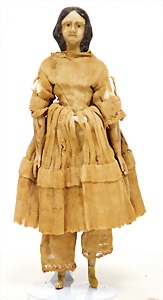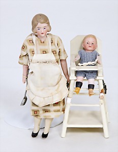 dollhouse doll, c. 1910, housekeeper, 15 cm, bisque heads, arms, and legs, fabric body, original clothes, 1 chair with all-bisque baby, upper part is loosely