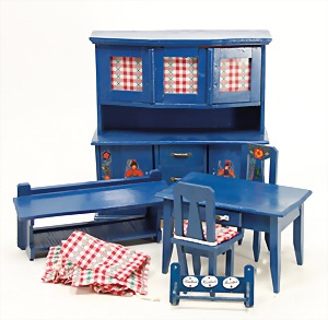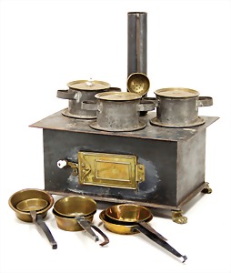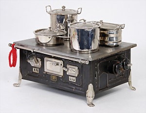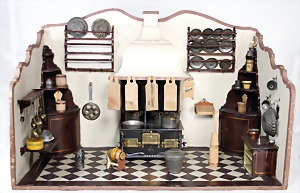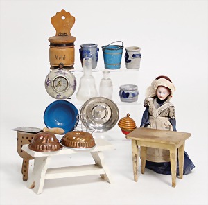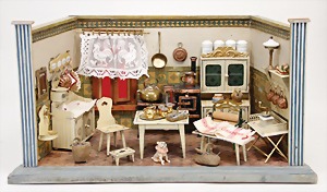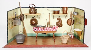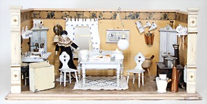 doll kitchen case, 72 x 34.5 x 33 cm, 1 windows without glazing, old and wallpaper at floor and wall, nice wood-furnishings, handpainted, small sheet metal stove with lion's paw feet, porcelain shoulder headed doll, enameled porcelain, black modelled hairstyle, fabric body, 22 cm, some decoration pieces like porcelain, tableware, cutlery box with cutlery parts, and other things