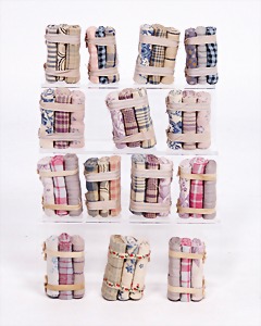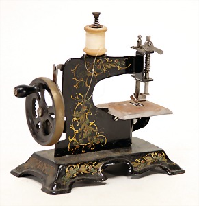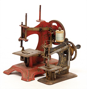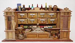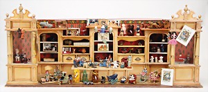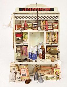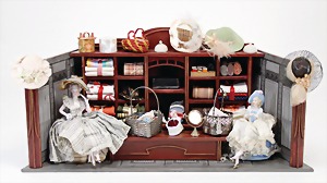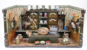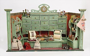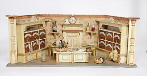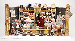 shop, furnished like a fashion shop, 84 x 41 x 40 cm, wallpaper is more recent, with richly accessories, with porcelain half-doll, fabric body, porcelain legs, 24 cm, 1 thumb is break off, with 2 small porcelain-half dolls (pin-cushion), decorative