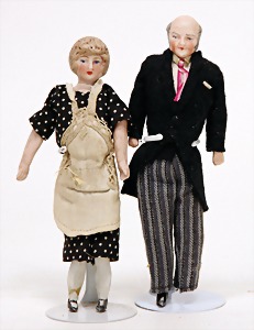 2 dollhouse dolls, lady, probably Simon & Halbig, 16 cm, bisque head, arms, and legs, fabric body, man, with appropiated moustache, 16 cm, bisque head, arms, and legs, fabric body