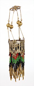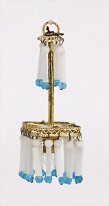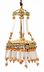 dollhouse ceiling lamp, partially made of gildedsheet brass, bottom tin, mounted glass beads, 15 cm