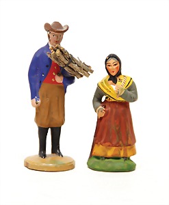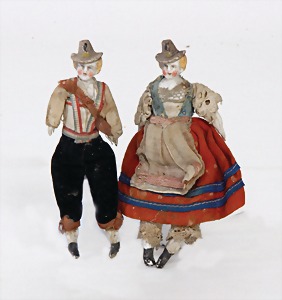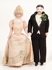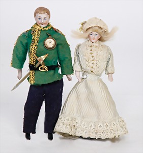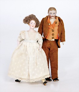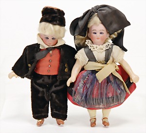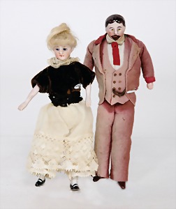 pair of dollhouse dolls, bisque breast plate heads, arms, and legs, fabric body, nice original clothes, man with appropiate moustache, 14 cm