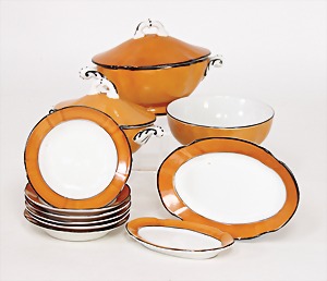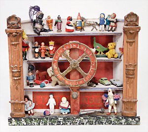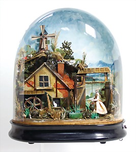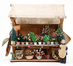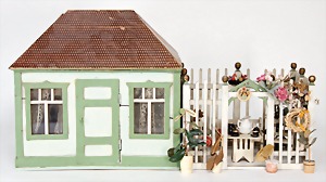 house, playable from all 4 sides, with a diameter of c. 95 cm, with roof garden, height: c. 65 cm, living room and bedroom art nouveau furnishings, wood, covered with silk, living room with chest of drawers, couch, 2 armchairs, 4 chairs, 1 table, kitchen, wood, with cupboard, hanging locker, small sheet metal stove, some porcelain accessories, wall holder for washing-up brush and other, in corridor with toilet, roof garden furnished with wood furnitures, covered with fabric, arbor is covered with tendrils of fabric flowers , roof and veranda were probably 1 x colorwise retouched