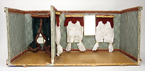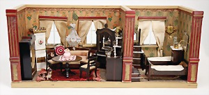 2-part dollhouse room, with oriel, 97 x 46 x 36 cm, old wallpaper at floor and wall, with Wilhelmine era wooden furnishings, bedroom and living room, oriel with Thonet living-room suite, tapestried with velvet, bedroom with 2 beds, linen cupboard, washstand, living room, living-room suite, covered with fabric, cupboard, chest of drawers, 1 chaise longue, tapestried with velvet, occasional table, 3 old curtain rods with clamps, 4 wall paintings, 1 x 6-armed chandelier, gildedbrass/sheet metal