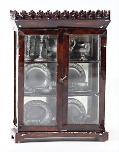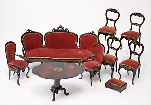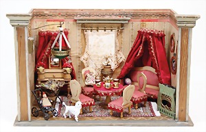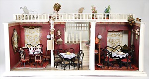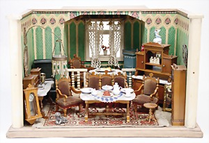 dollhouse case, 3-part, with terrace at roof and staircase, 80 x 33 x 35 cm, with 3 x Thonet-living-room suite, tapestried with velvet, with some decoration pieces, porcelain coffee-service, big wall mirror, bead curtain, wall lamps and other things