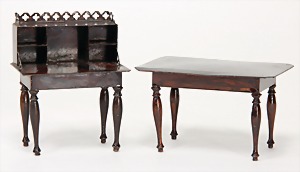 manufacture dollhouse, 2-storey, front can be opened, 40 x 24 x 40 cm, windows without glazing, with balcony, ground floor with nice living room-furniture program, wood, front is decorated with ornaments, couch and chair are covered with leather, 1 bathroom with washstand, toilet and bathtub, top floor with wood bench, table and armchair