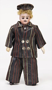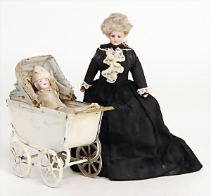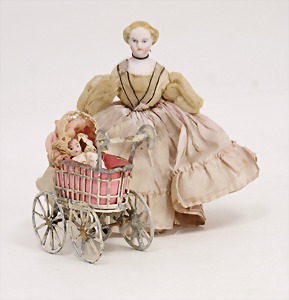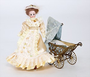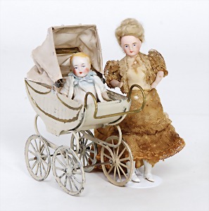 dollhouse doll, c. 1910, bisque breast plate head, arms, and legs, fabric body, original clothes, with small pram, with mass doll