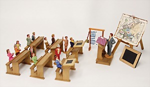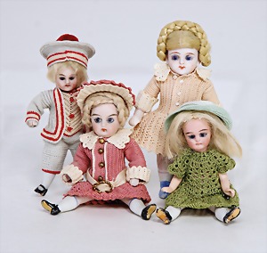 4 dollhouse dolls, children, all-bisque, 8.5 - 10.5 cm, crocheted clothes, maybe for school