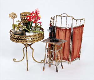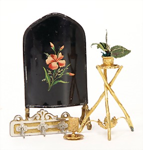 dollhouse decoration pieces, flower table, 3 tiers, upper bowl is supported by a figure, 12 cm, handpainted sheet metal, 1 folding screen, tin side table, small telephone