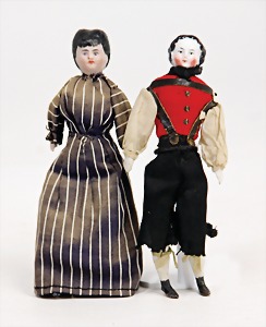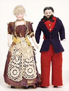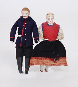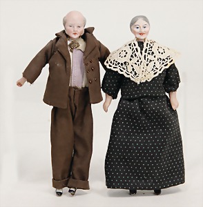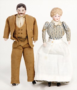 2 dollhouse dolls, man, 16 cm, bisque breast plate head, arms, and legs, appropiate moustache, lady, 15 cm, bisque breast plate head, arms, and legs, fabric body, clothes old or sewed of old fabric