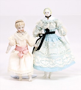 2 dollhouse dolls, bisque breast plate heads, arms, and legs, 11.5 cm, with appropiate hairband, man with moustache, 12.5 cm, old clothes
