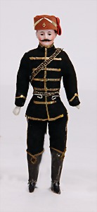 2 dollhouse dolls, soldier, 12.5 cm, bisque breast plate head, arms, and legs, appropiate moustache, fabric body, felt clothes, lady, bisque breast plate head, arms, and legs, fabric body, old clothes