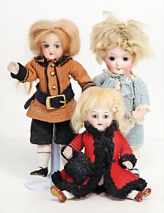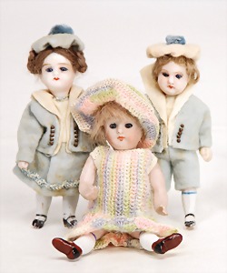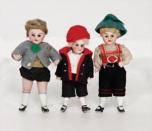 3 all-bisque dollhouse dolls, children, 9.5 cm, fix inset glass eyes, wig, appropiate clothes