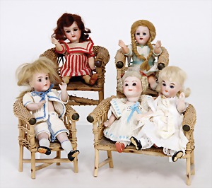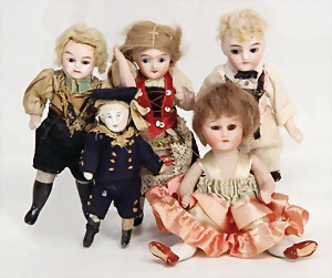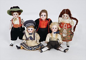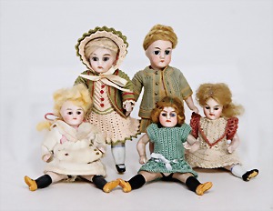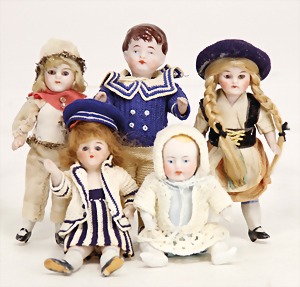 5 dollhouse dolls, all-bisque, children, 9.5 - 10 cm, fix heads, fix inset blue glass eyes, old clothes, for a dollhouse room or for a school