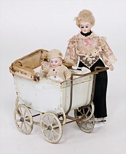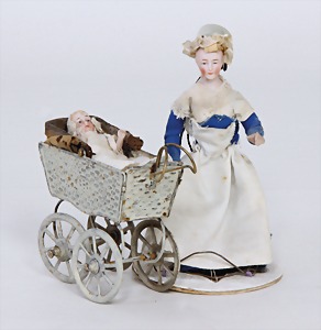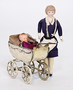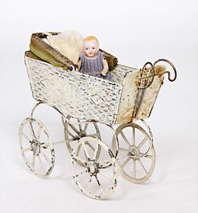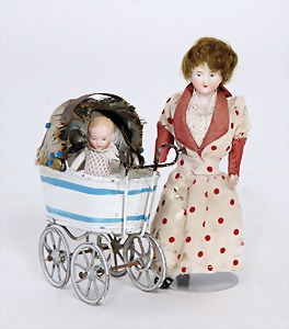 dollhouse doll, housekeeper, 12.5 cm, bisque head, arms, and legs, fabric body, nice original clothes, with a small pram, lithographed sheet metal