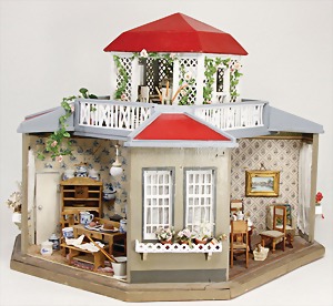 summer house, 30 x 25.5 x 32 cm, with 3 windows, glazed, nice wood furnishings, roof is stuck with paper, some small patches with flaws, with 1 arbour, 22 x 28 cm