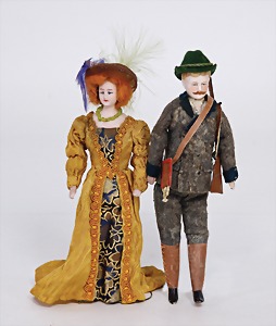 2 dollhouse dolls, huntsman, 18.5 cm, bisque breast plate head, arms, and legs, appropiate moustache, felt clothes, lady, 17 cm, bisque breast plate head, arms, and legs, reddish wig, fabric body