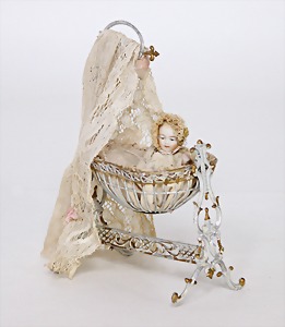 filigree dollhouse cradle, tin, 13.5 cm, with small all-bisque baby, original material cover