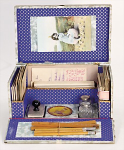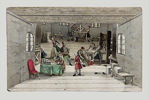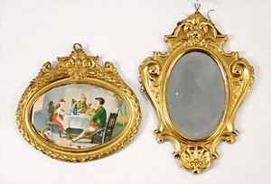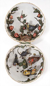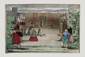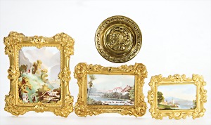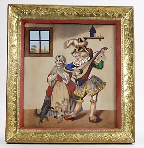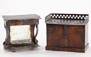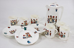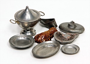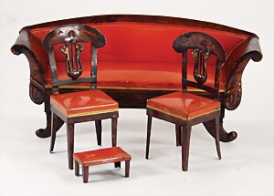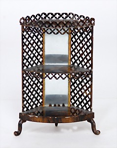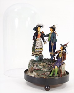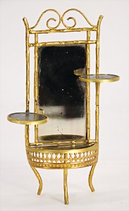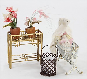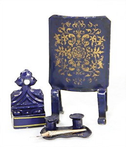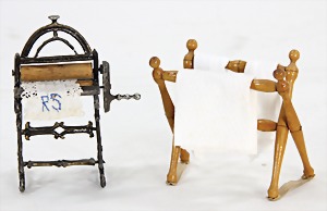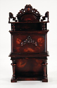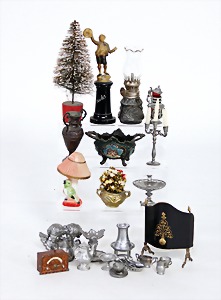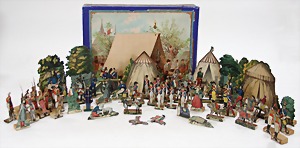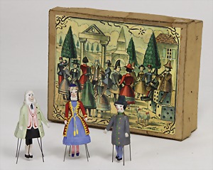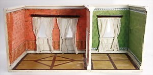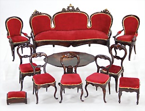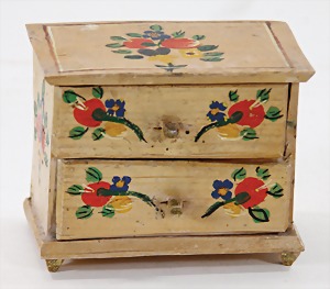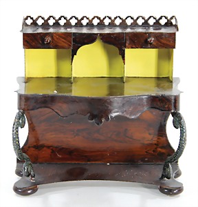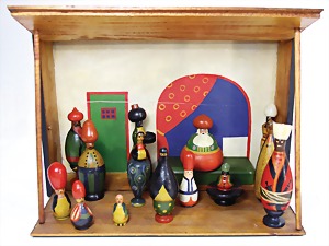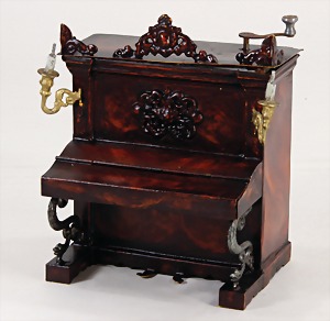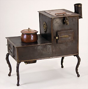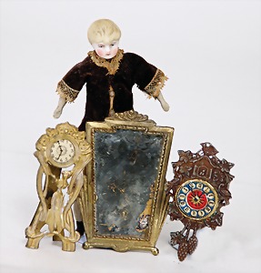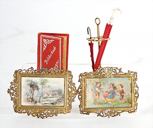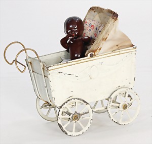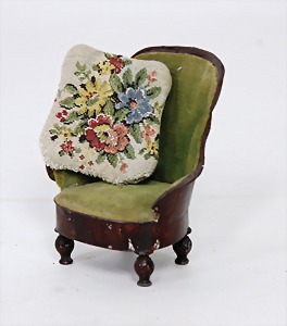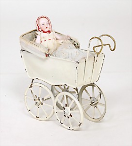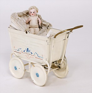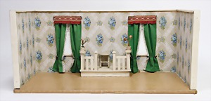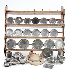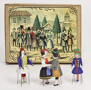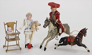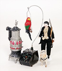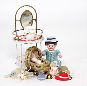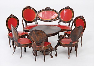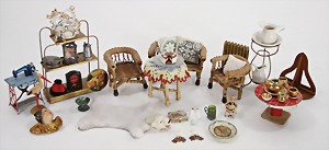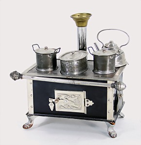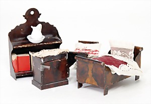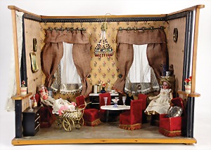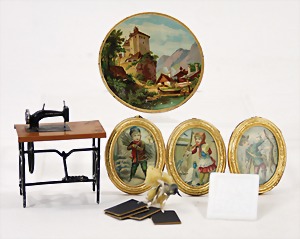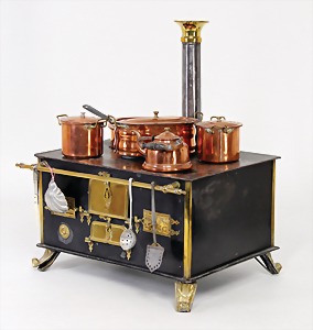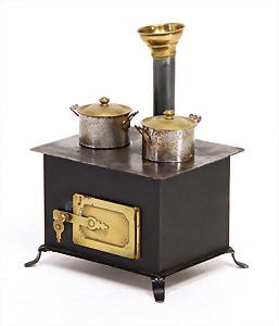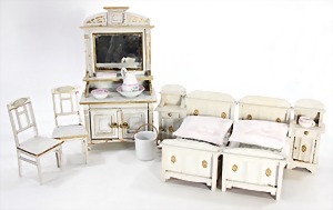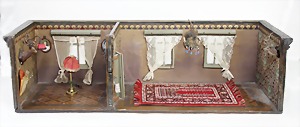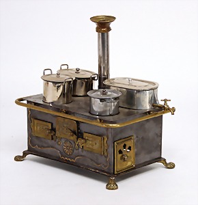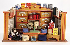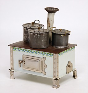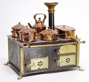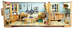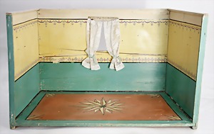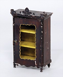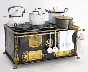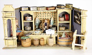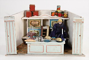 dollhouse kitchen, with pantry, c. 1895, 1.11 m wide, 45 cm tall, 47 cm deep, original painting, original furnished, with corner cupboard, store cupboard, shelves, washstand, richly accessories, sheet metal, porcelain, wood, some aluminum parts that are slightly more recent, very nice unused loft find, in great original condition, with 4 feet that can be screw in