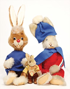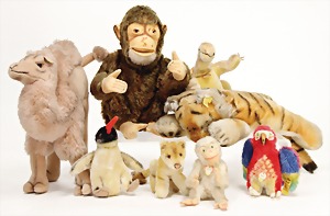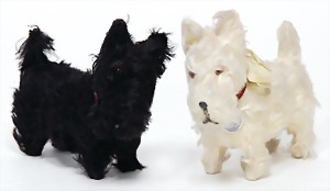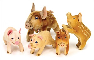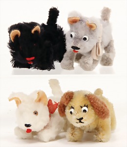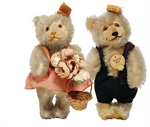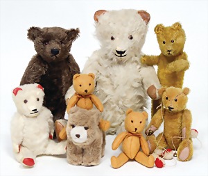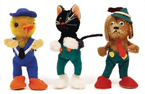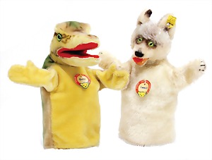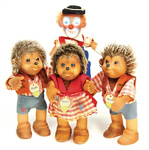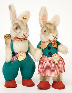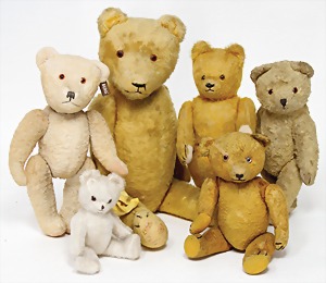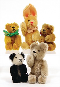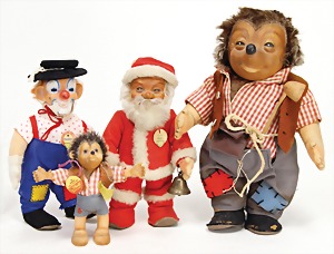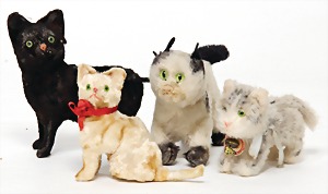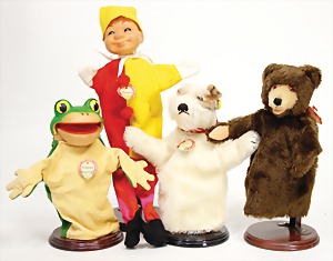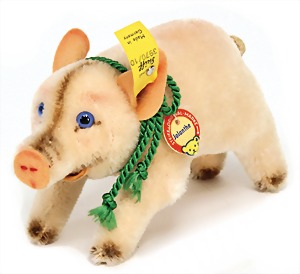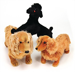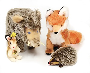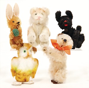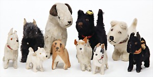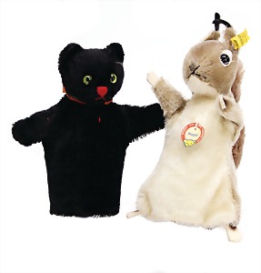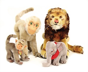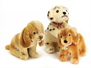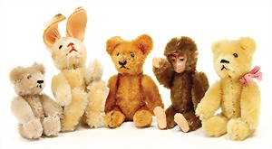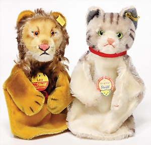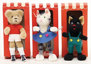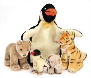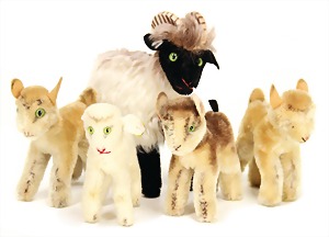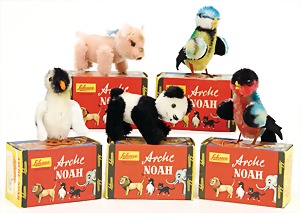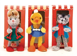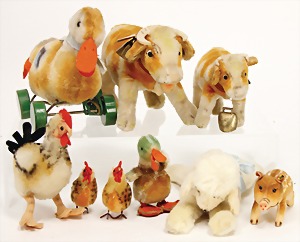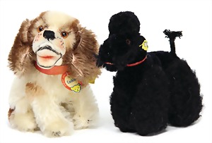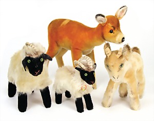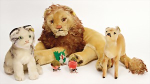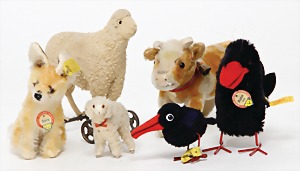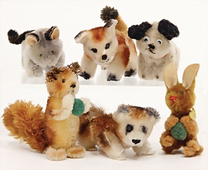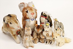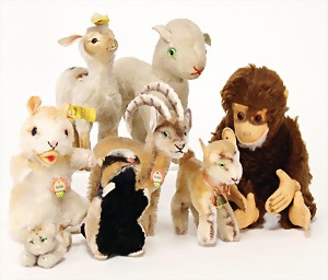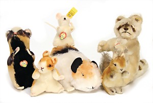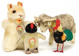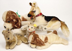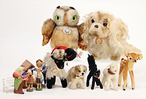 mixed lot, Peky, complete, No. 3330.00, owl, 23 cm, with chest label, without button and cloth tag label, chest label is strongly worn, Snucki, complete, No. 1317.00, St. Bernhard, 11 cm, chest label is worn, without button, black tom cat, lamb, Bambi, used, 1 ladybird, more recent, 2 Hausser mass figures, Hansel and Gretel, small articles