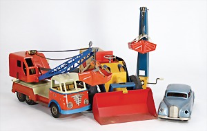 Konv. 5 Blech-Fahrzeuge, 3 x Made in China, bespielt, darunter 1 STEIFF-Holzkran, alles bespielt