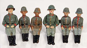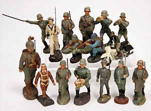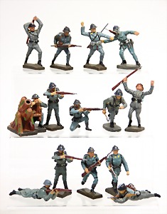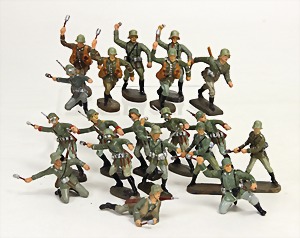 Elastolin u. Lineol, 2. Weltkrieg, Masse, 7,5 cm, 19 Teile, kämpfend mit Handgranate, teilw. mit Gasmaske, meist Zust. 2-3