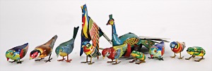 Konv. Blechspielzeug, darunter 7 Vögel, 2 Frösche, teilw. Uhrwerk intakt, bespielt, 1 Blechvogel mit Druckmechanismus u. Pieps-Stimme, 1 Pfau, Alter?, Uhrwerk intakt, 18 cm