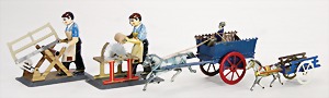 Konv. 4 Teile, Blechspielzeug, 2x Kutsche, Alter?, 13 cm u. 18 cm, dazu 2 WILESCO Dampfmaschinen, Maschinenantriebs Modelle, neu, Männer an Säge