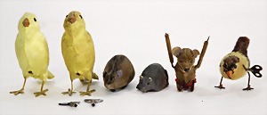 Konv. 5 Aufzieh-Figuren, darunter SCHUCO Tanzmaus, nicht kompl., Vogel, Maus, 1 SCHUCO Maus mit Frigtionsantrieb, 2 Vögel mit Kunstplüsch bezogen