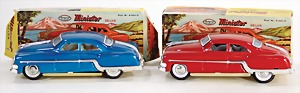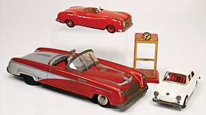 Konv. Blech-Spielzeug, PN Cabriolet, 31 cm, Blech lithogr., Friktionsantrieb, mit sich bewegenden Scheibenwischern, Fahrerfigur, JNF Kondor, ohne Frontscheibe, ohne Schalthebel, bespielt, 1 VW 1500 Japan, ohne Frontscheibe, sonst gut, Friktionsantrieb, kl. Telefonzelle, Blech