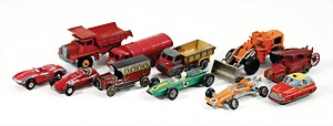 11 kl. Fahrzeuge, versch. Hersteller, darunter MATCHBOX, MAJORETTE, LESNEY, 4x SCHUCO Rennwagen, alles bespielt