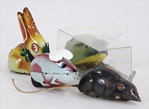 4 Aufzieh-Tiere, Blech, SCHUCO Frosch, Samt bezogen, Lehmann Hopp Hopp, Nr. 918 u. 2 Aufziehmäuse, Made in Japan, Uhrwerk intakt