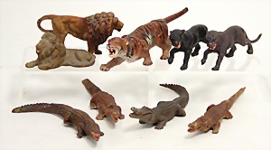 Konv. Wildtiere, Elastolin u.a, Krokodile, Löwen, Tiger, Panda, Panda Zust. 1-2, sonst Zust. 3, mit kl. Beschädigungen