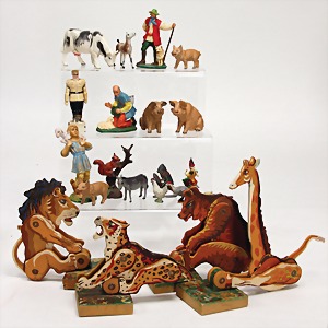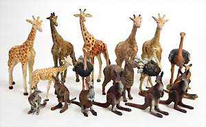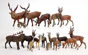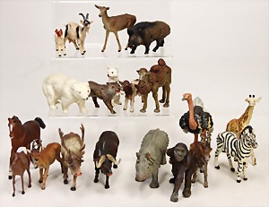meist LINEOL oder ELASTOLIN, Tierfiguren, Affe mit Stein, Anthilope, Bock, Hirsche, Nashorn, Bär, Strauß, Kamel, Zebra, Wolf, meist Zust. 2
