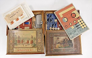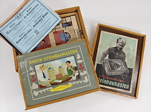 2 Steinbaukästen, 1x Nr. 7, 2-lagig mit Metallteilen, mit Anleitung, wohl bis auf wenige Steine kompl., auf Vollständigkeit nicht geprüft, Orig.-Holzkiste mit bunt lithogr. Deckbild u. Anker Richters Steinbaukasten, Nr. 8, ohne Eisenteile, 2-lagig wohl bis auf wenige Steine kompl., Orig.-Holzkiste, bunt lithogr. Deckbild